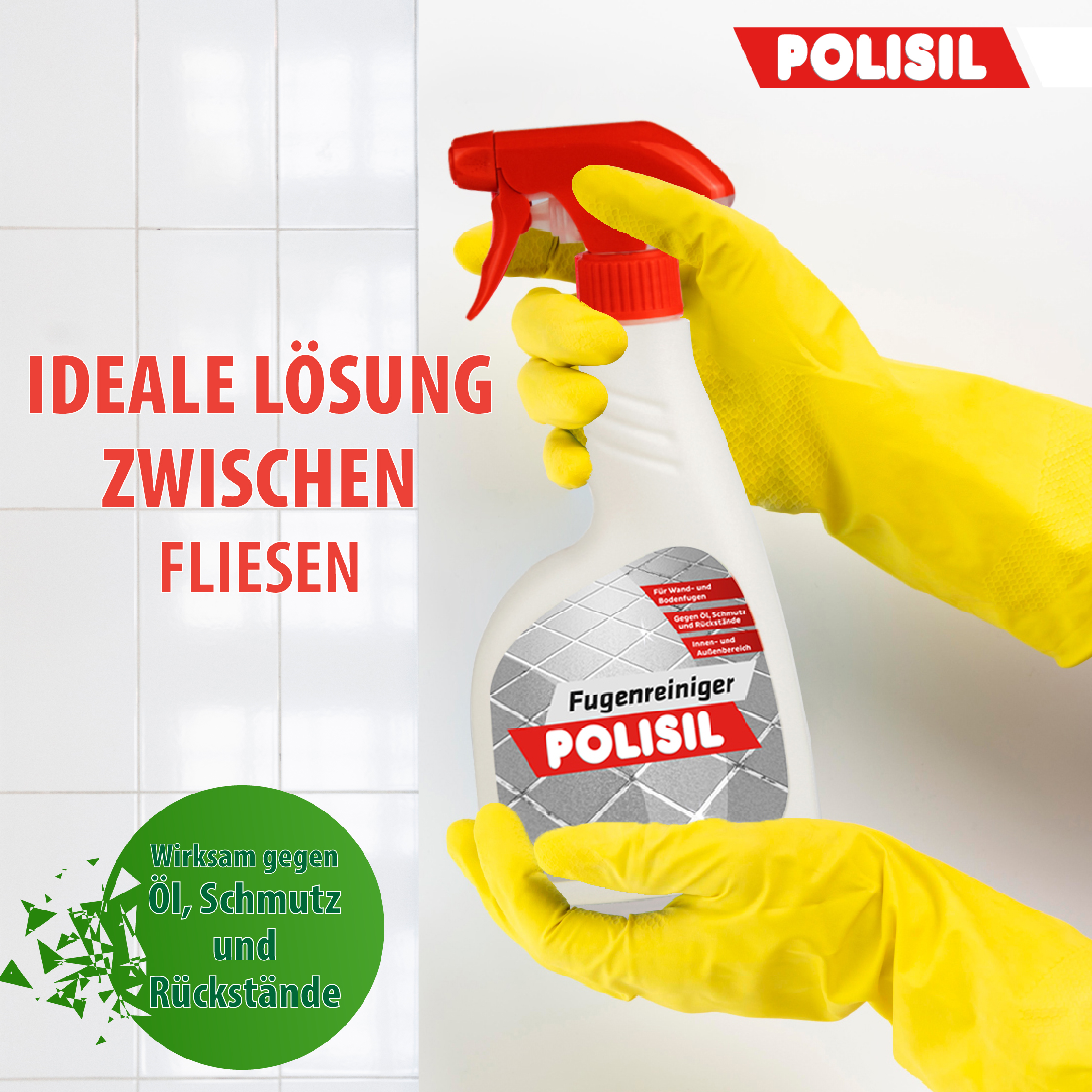 Polisil Fugenreiniger entfernt Rückstände, schwierigen Schmutz und hartnäckige Ölflecken an Wand- und Bodenfugen. Dient zur hygienischen Reinigung von Fliesenfugen in Küchen oder Bädern.