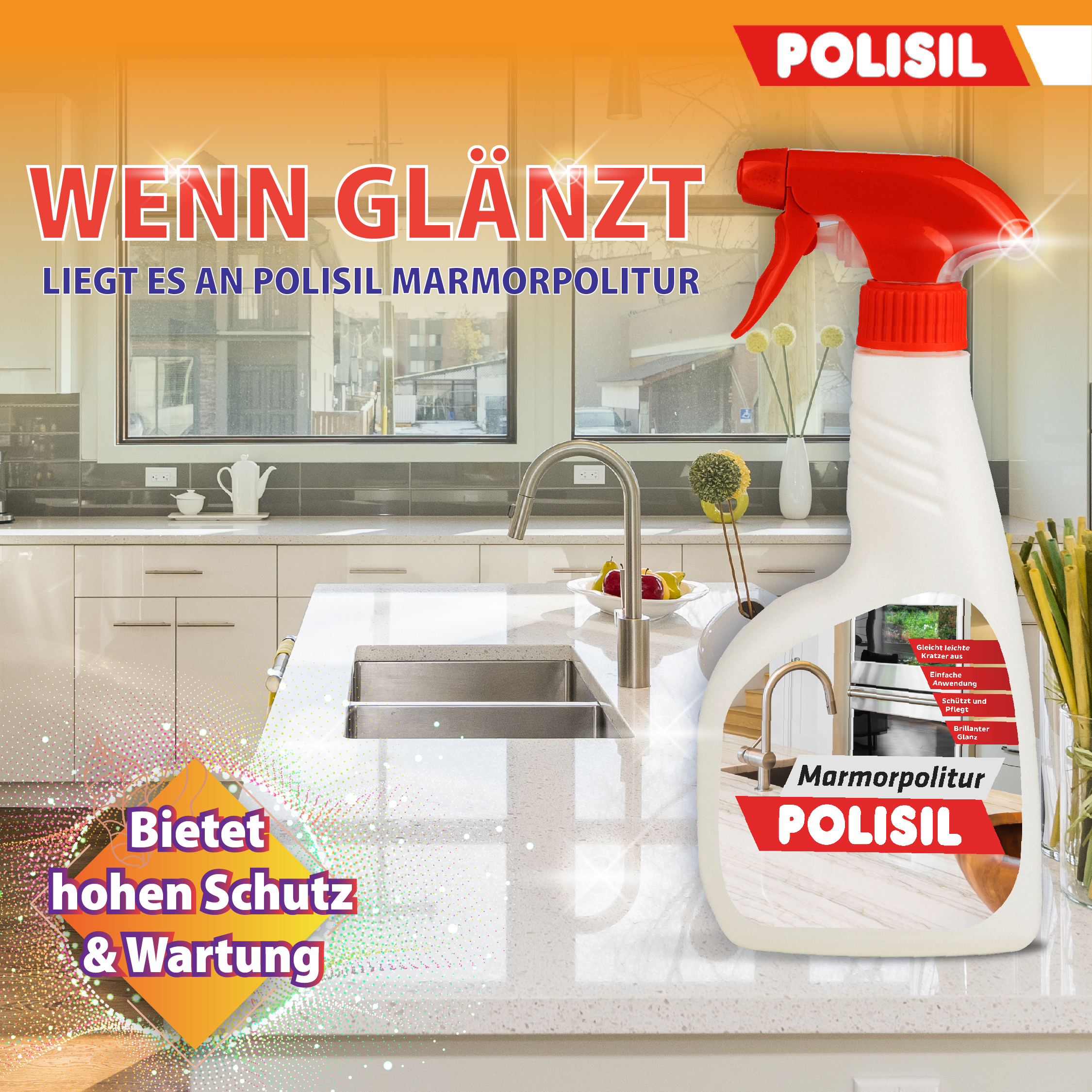 Polisil Marmorpolitur verleiht matten und stumpfen Marmoroberflächen ein lebendiges Aussehen und schützt vor Wassertropfenflecken und Verschmutzungen. Durch die regelmäßige Anwendung wird die Entstehung von Gebrauchs- und Laufspuren verringert und abgedeckt. Es ist einfach, die Polierarbeit zu erledigen und einen brillanten Glanz zu erhalten. Sie gleicht leichte Kratzer aus.